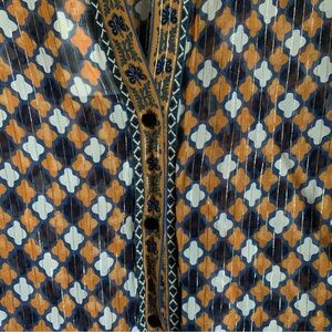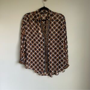 NWT Zara Woman Premium Denim Collection Geometric Print Metallic Blouse Size extra small. XS. In great condition. Oversized fit. Loose fit silhouette Sheer Navy velvet buttons at front. Smoke free home.