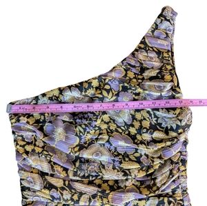 NWT Zara One Shoulder Athena Style Mini Dress. Ruffle Layers of Floral Pattern. Gold Shimmer within. Fully Lined Zip up. Please see pics for approximate measurements. Feel free to contact me with any further questions.