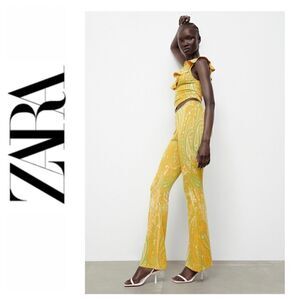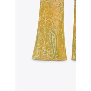 NWT Zara Yellow & Green Jacquard High Waisted Pull On Flare Pants, Size Medium