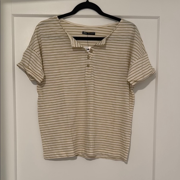 NWT Zara cotton top shirt buttons striped cream and greenish brown
