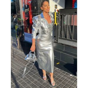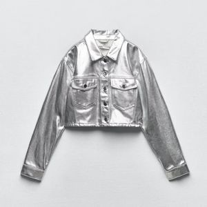 Cropped jacket with lapel collar and long sleeves. False front flap pockets. Front metal button closure.