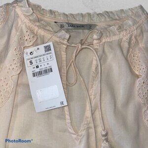 NWT- Zara womens Ruffle/Eyelet Long Sleeve Size Small, Peach, Tassel Tie. Round neckline with small ruffles open keyhole with tassels that tie. Eyelet scallop trim on sleeves that taper at wrist. Size Small Measurements Bust( pit to pit): 20 inches Length: 23 inches
