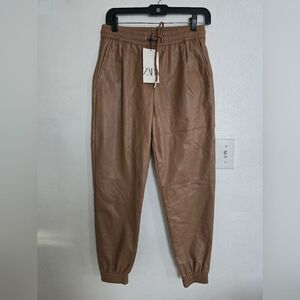 NWT Zara Drawstring Faux Leather Joggers In Tan Size Xs