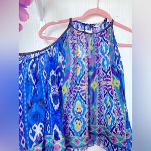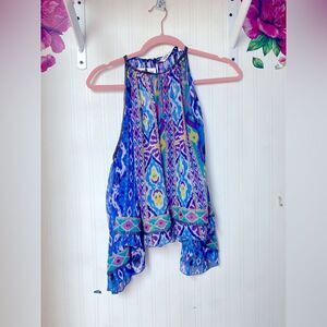 Colorful top with vibrant patterns. Features blue, purple, and yellow designs.