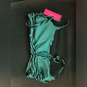 This bikini top features a bralette design with a green and black zebra print for a fun look.