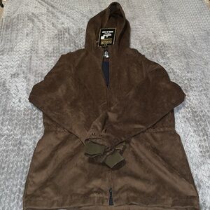 Lined. Hood with drawstring. 2 way zipper. Draw string waist.