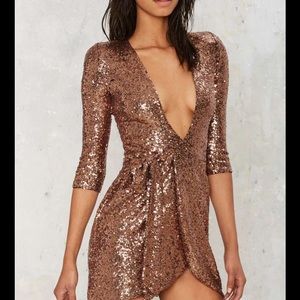Australian label Zhivago, which means 'daring' in Russian, reaffirms the fact that fashion is art, and that you can look badass and beautiful at the same damn time. Their Sovereign of Stars Dress features allover rose gold sequins, wrap design with tie closure, mid-length sleeves, and mini length. Fully lined. Polyester. New with tags