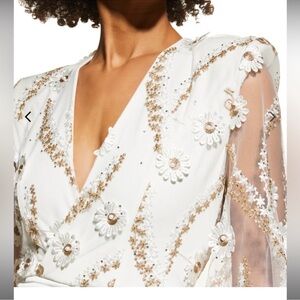 Embellished with iridescent floral embroidery, daisy appliques, acrylic pearls, and crystal accents