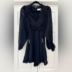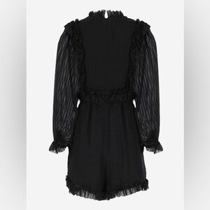 New with tags. Zimmerman Maples Frill Playsuit Stripe Ruffle Romper in black. Zimmerman size 1, US size small (true to size). Partial zip back closure. String ties at neck and removable string tie at waist, all with gold metal tassels. Ruffle accents throughout. Sheer sleeves and overlay with lined body and shorts. Elastic bands at cuffs. Lightweight.