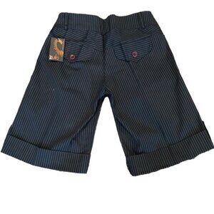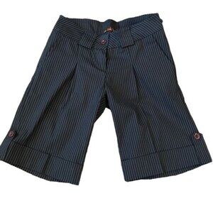 Stylish striped Bermuda shorts with a tailored fit and button accents, ideal for casual or semi-formal settings. Waist to hem = 19 inches, Waist (laying flat) = 14 inches, inseam = 11 inches