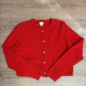 A Vibrant Red knit cardigan featuring elegant gold buttons and convenient front pockets.