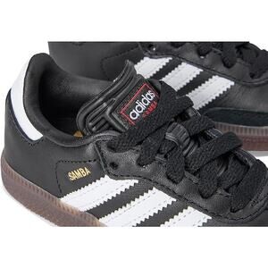The adidas Samba Indoor Sneaker – Black/White/Gum (US 2 Unisex Little Kid) is a kid-sized version of the iconic indoor soccer shoe. It features a full-grain leather upper with suede toe overlay, cushioned EVA insole, and a non-marking gum rubber outsole. This shoe delivers reliable grip and support for active play indoors, while its classic design offers versatile, everyday style