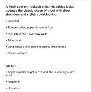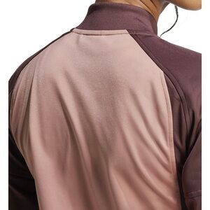 The NWT adidas Women's Size L Tricot 3-Stripes Track Jacket in Warm Clay/Aurora Ruby is a stylish activewear jacket made of 100% polyester with a colorblock pattern featuring burgundy and rosy tan tones. This short-length jacket has long sleeves and a full zip closure, making it perfect for all seasons and athleisure occasions. Machine washable and with a regular fit, it is a comfortable and versatile addition to any woman's wardrobe, made by the renowned brand adidas.