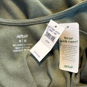 NWT aerie Ribbed Knit Sleeveless Tank Dress in Army Green, size M. Tie front, knotted front. Style 9955. Stretchy comfortable 58 cotton, 38 poly, 4% elastane for a perfect flattering fit. Pit to pit 17", pit to hem at side seam 25.75". Great casual look! In perfect new condition. Retail $39.95. Aerie is a division of American Eagle Outfitters. Ships promptly from non-smoking home. (#8082)