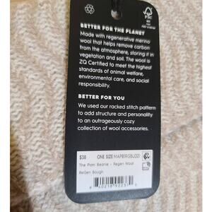 Regenerative Wool: See that cool label? Our Pom Beanie in Bough was made with lower carbon regenerative wool from Temple Peak Station in NZ, which is about as good for the planet as it gets.