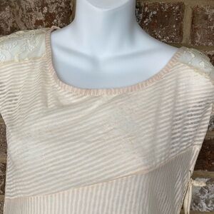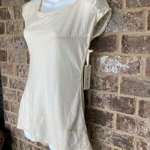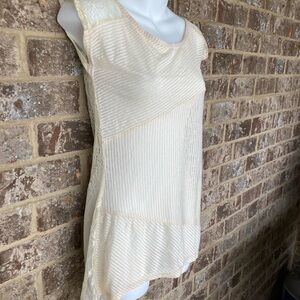 Altered state size small new with tags cream colored cap sleeve top. Gorgeous lace on back of top. See pictures for details. Armpit to armpit measures 16". Shoulder to hem line measures 25 inches. 100% polyester. Contrast 90% acrylic 10% spandex. So pretty.