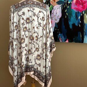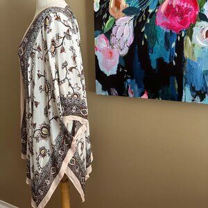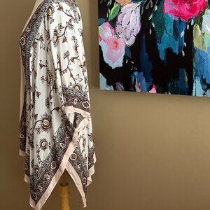This Kimono is New With Tags and has never been worn. It has an open front and a beautiful design with a pink accent border.