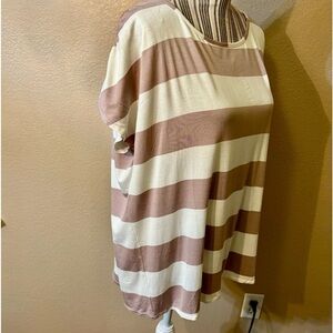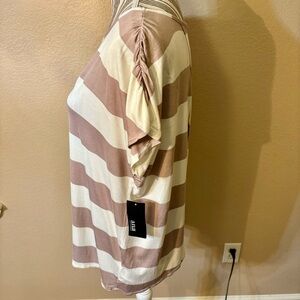 The Top features White and Khaki horizontal Stripes. Ruching on the Shoulders is very Flattering.
