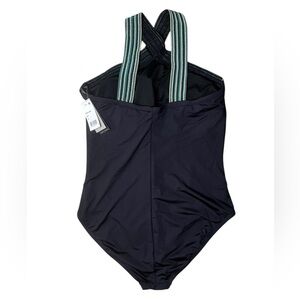 New with tags Kenneth Cole Reaction one-piece swimsuit in classic black, size 1X. Features built-in tummy control to smooth and contour the midsection for a flattering silhouette. The wide, crisscross elastic straps in multicolor stripes add a fun pop of style and supportive comfort. A sleek and confident swim staple you’ll reach for again and again.