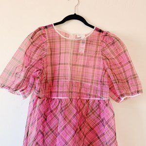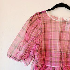 le fou wilfred hula blouse from aritizia this is a puff-sleeve, babydoll blouse with a voluminous, gathered bottom tier and a self-tie cutout detail at the back neckline. gathering at sleeve caps and cuffs as well. it’s made with sheer Italian organza in a beautiful yarn-dyed check.