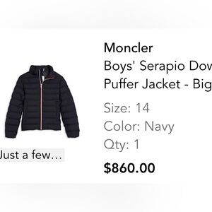 Moncler down puffer jacket . Big kids size 14. Girls or boys Fits ladies small also. I bought it for myself but missed the strict return window from Bloomingdale’s.