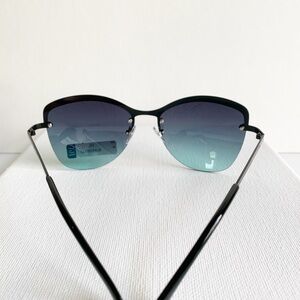 Semi rimless blue / green lens sunglasses. Gold accents and black ear pieces.