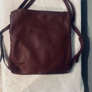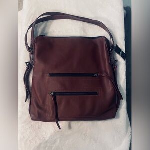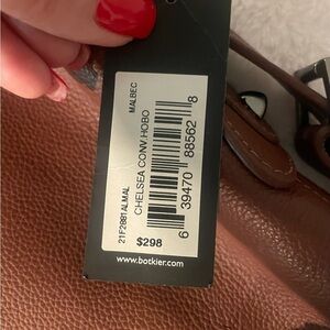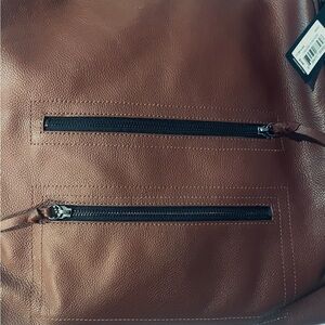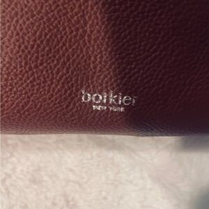 add this Botkier purse to your accessory closet with double zippers on the front and open inside with one pocket on the inside. The length is 15 1/2 inches and the width is 15 1/2 inches. It has stylish double zippers on the front with excellent detailing.