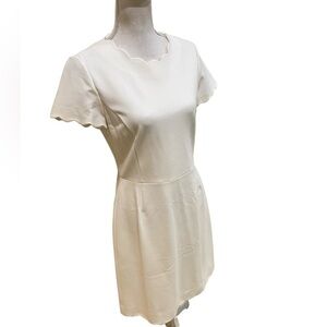 New with tags Brooks Brothers Red Fleece off white Ponte knit scalloped hems and neckline. Short sleeve. Back invisible zipper. Above the knee. Made of nylon/rayon/polyester/elastane.