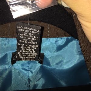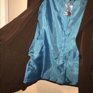 NWT never worn brown w/ teal pinstripes blazer/business jacket. In Moda brand. Single button closure. 2 functional front pockets. Teal back lining. 2 shoulder pads already stitched in but could easily remove if you like. Comes with extra button. Size 8.