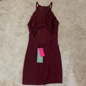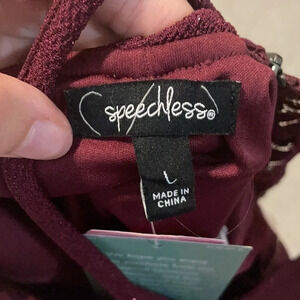 NWT burgundy Speechless sparkly lace dress size large high neck. Has a zipper in the back and has a slight open back. Super cute midi dress for homecoming or formal events! Materials shown in pics.
