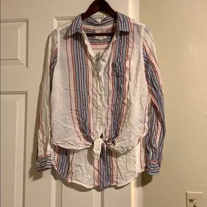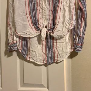 White white button down with a knot front, that’s perfect for layering. It is wrinkly, but will come out with an ironing.