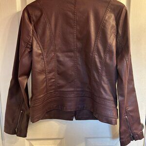 This coated biker jacket in Black Cherry revs up your style with modern lines. Front seaming, snap waist tabs, a snap collar and exposed zippers on the pockets and cuffs finish this jacket with classically cool details. Perfect for any occasion. New with Tags from White House Black Market.