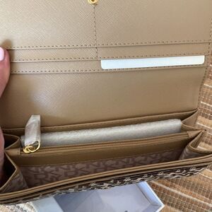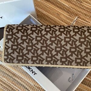 NWT clutch wallet with side zip and snap front closure DKNY brown and tan