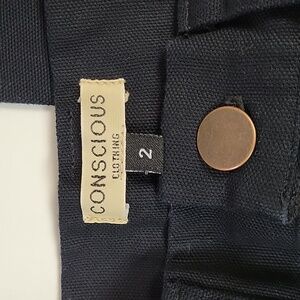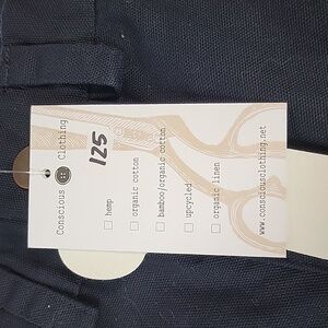 new with tags black sz 2 pants. front slash pockets, no back pockets. organic cotton upcycled material. 26" waist, 11" rise, 29" inseam. material is thick like canvas