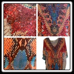 NWT crystal-embellished sheer tunic, wrap or swim coverup. one size fits all! Wear it out for a fun evening or enjoy as a swim suit cover-up. Gorgeous colors and prints: mango, blue, reds and greens. Python print plus florals. So fun!! Flow-y; drapes beautifully!