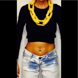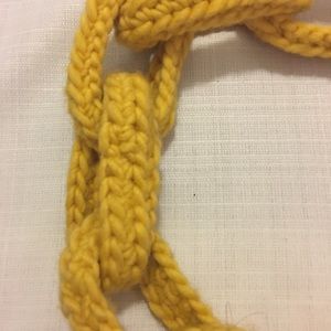 NWT only used in photo shoot. Never worn. Perfect condition. New condition. One of a kind custom made chain link hand knitted accessory scarf. Super unique. Great with a tee, bomber jacket and jeans. Or wear out with leather pants, pumps and seamless tank. Mustard yellow. Wool hand knitted. Measures about 15 inches long. Each link is about 3.75 inches. Could also make for super unique gift for the upcoming holidays. One of a kind.