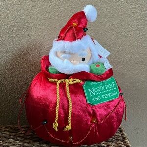 red and white Santa Claus Christmas figurine with a fuzzy brown face