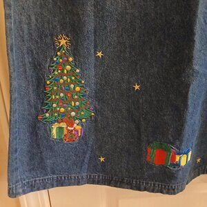 NWT denim maxi skirt embroidered with a Christmas tree, stars, and presents in size 16.