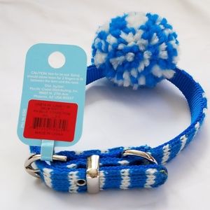 Net dog collar from Pet Holiday. Blue and white knit with big blue and white pompom. Adjusts from 13.5"-9.5"