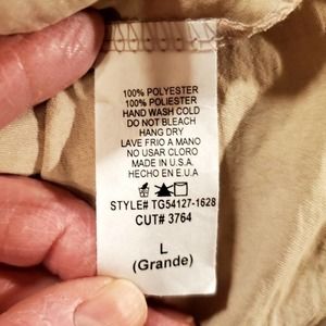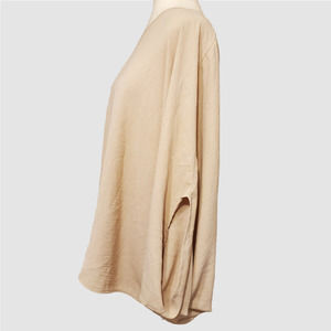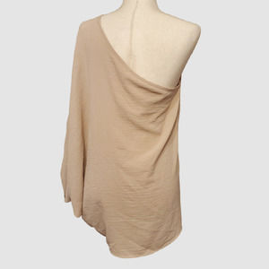 Gorgeous, drapey, silk-like, nude, off-one-shoulder blouse. Top is pre-owned but new with togs and in excellent condition. No stains, tears, or holes. Will fit a variety of sizes due to the cut.