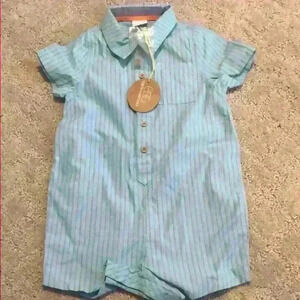 New aqua blue Oscar romper with collar, buttons and snap bottom.