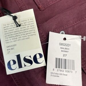NWT else Malbec Wine Burgundy Skinny Denim Jeans in size 27. Excellent new condition. Traditional five pocket style, zipper and button front closure, stretch denim, mid rise. Please see photos for approximate measurements and details. Item may show difference in color based upon photography and perception. Photos are part of the description, as everyone’s level of condition may vary. From smoke free and pet free home. All packages are shipped the same or next business day.