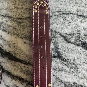 The product is a wide woven faux leather women's belt in Cordovan brown. It features a solid pattern, a wide belt width, and a stylish buckle accent. This belt is perfect for adding a touch of sophistication to any outfit, with its timeless style and unique design. The medium size and regular fit make it a versatile accessory for any woman's wardrobe.