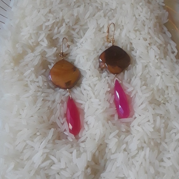 Fuschia dyed crystal elegant drops with shells that are golden tan and an iridescent colors over it. These are handmade and designed by myself, Helen. Jewelry is an essential part of a woman's outfit. You can dress these beauties up or down. Very versatile. You will get so many compliments when out in the city. If not for you, get them as a gift for someone who loves fashion. They are made with gold toned wire. My jewelry is priced reasonably as I believe it making fashion affordable.