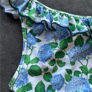 A cute pick for pool days and beach trips, this one-piece swimsuit unites a one-shoulder silhouette, ruffle trim, and a pretty hydrangea motif.