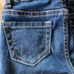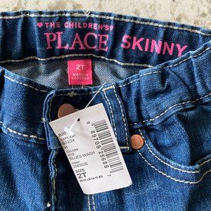 Children's Place skinny straight leg jeans are dark wash with white contrast stitching.