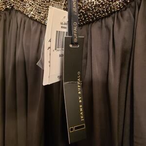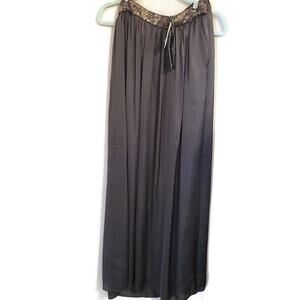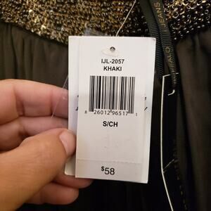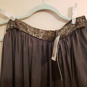 Picturing the size small khaki brown mini skirt has a sheer maxi length over skirt - and bling at waist. Very pretty and elegant!