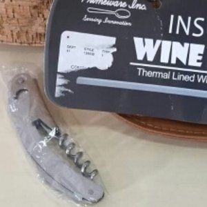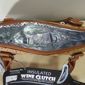 NWT insulated wine clutch with corkscrew. Thermal-lined by Primeware Inc. Keeps bottle chilled to perfection. Holds standard 750 mL wine bottle or champagne bottle. Can also be used for snacks or other beverages, water bottles, etc. Includes zipper pocket for corkscrew. Bag is approximatey 15 inches long and is faux cork-looking material.