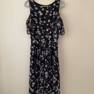 Knee length. Brand new with tags. Beautiful floral pattern. Size 14. Has the open shoulder details. Tie waist. It is fully lined with a chiffon overlay. Perfect dress for the spring and summer. Great wedding guest dress
