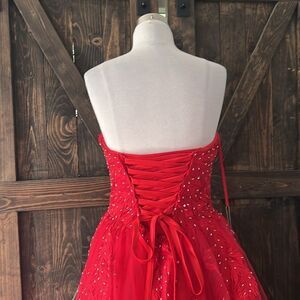 New with tags, beautiful dress can be adjusted in the back lace up strap measurements are posted approx zips up to just above then rest is lace up adjustable that’s how it’s in back perfectly fine on zipper